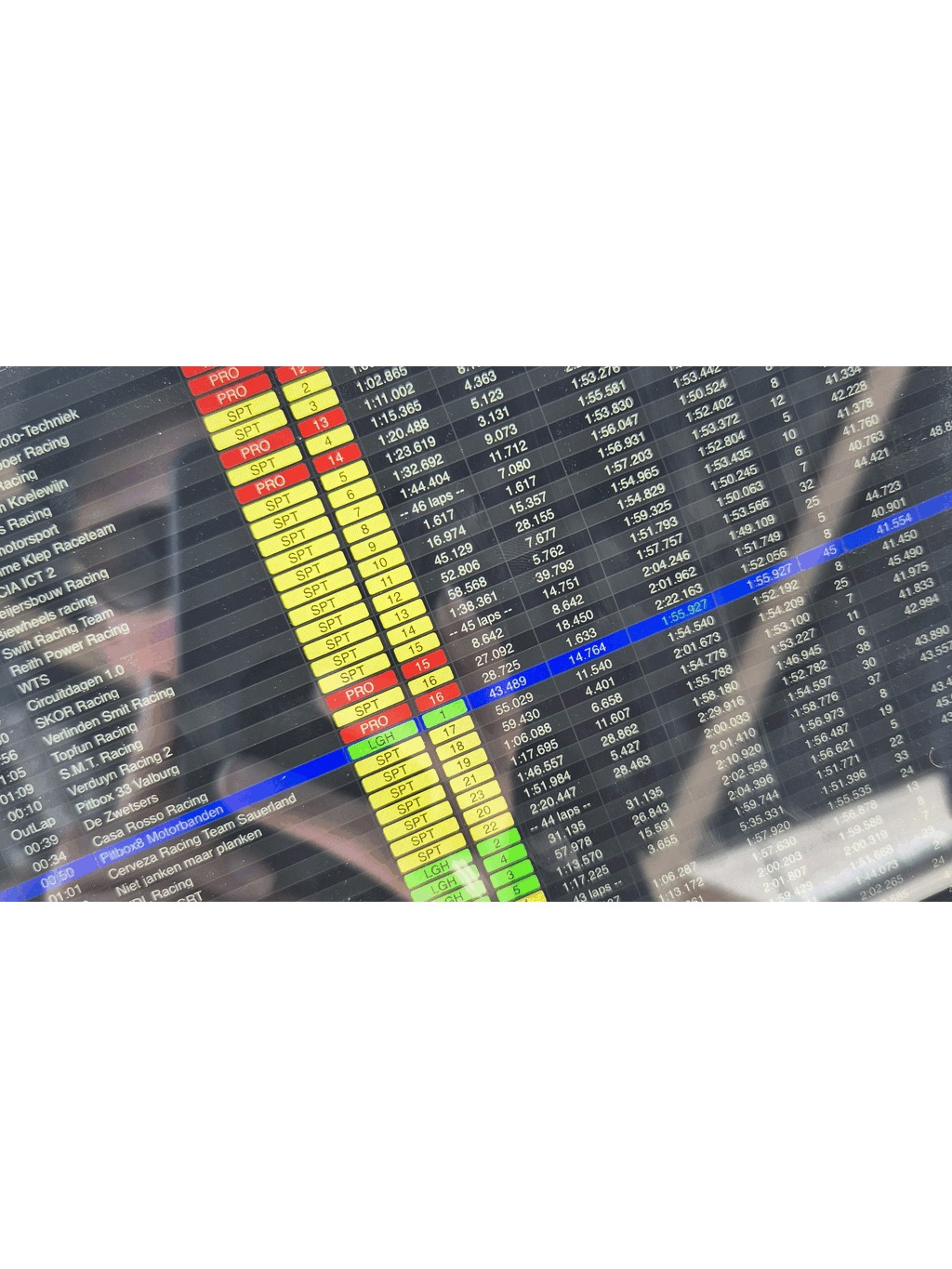 And this long strategy payed off! After 2 hours we where 1st in our class and even 31st of the total field. After 3,5 hours it got tough, energie was getting lower and quite some laps done in the long stints. Even broke my personal PR by doing a 1:55.680 together with many 1:57, 1:56 laps we opened up a full lap to the 2nd rider of the light class.